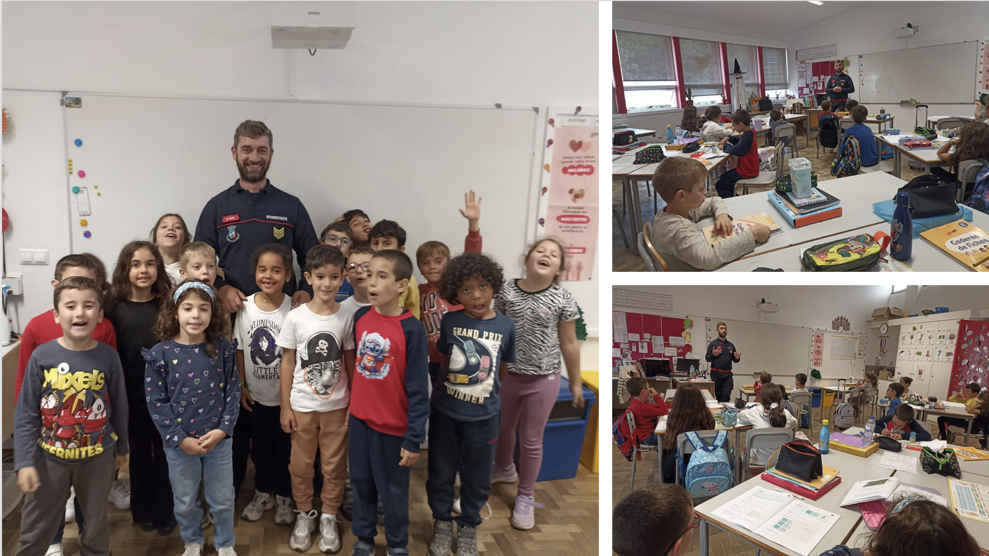 Hoje, a aula foi diferente e muito emocionante. Recebemos o bombeiro Nuno, que foi convidado pela família da nossa colega Joaninha. Ele contou-nos muitas coisas importantes sobre o trabalho dos bombeiros e respondeu a todas as nossas perguntas — e eram muitas mesmo!