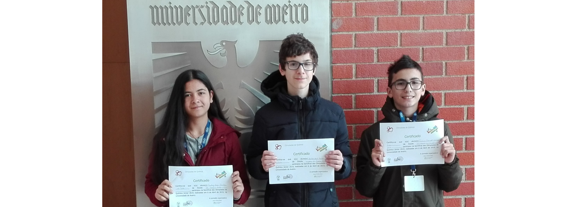 Parabéns aos alunos Eurico Pinho - 9.º A, Sebastião Teixeira - 9.º B e Beatriz Pinho - 9.º C pelas suas participações nas Semifinais das Olimpíadas de Química Júnior que decorreram na Universidade de Aveiro, no dia 6 de abril