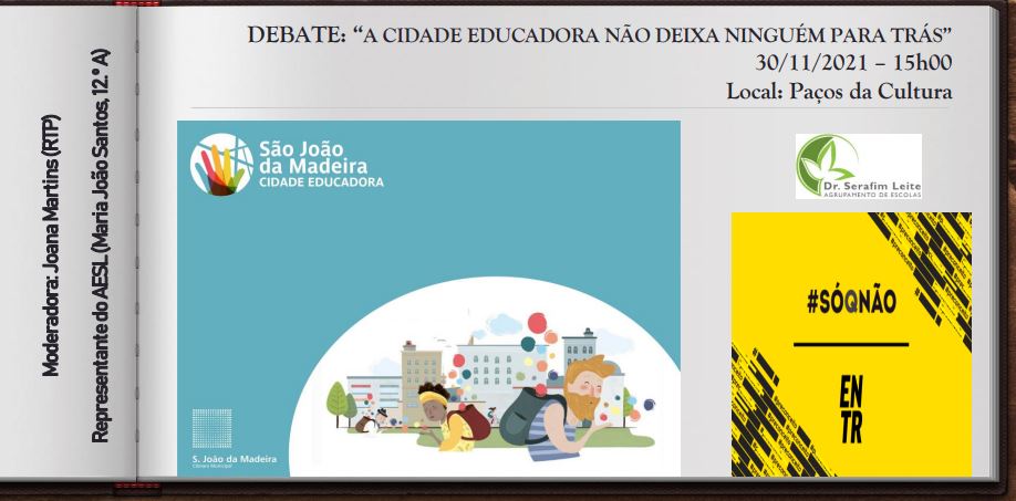 Debate, sob o lema “A cidade educadora não deixa ninguém para trás”, organizado pelo Município de São João da Madeira em parceria com a RTP Multimédia e os seus projetos #soquenao e #ENTR, integrando o programa municipal das comemorações do Dia Internacional das Cidades Educadoras.