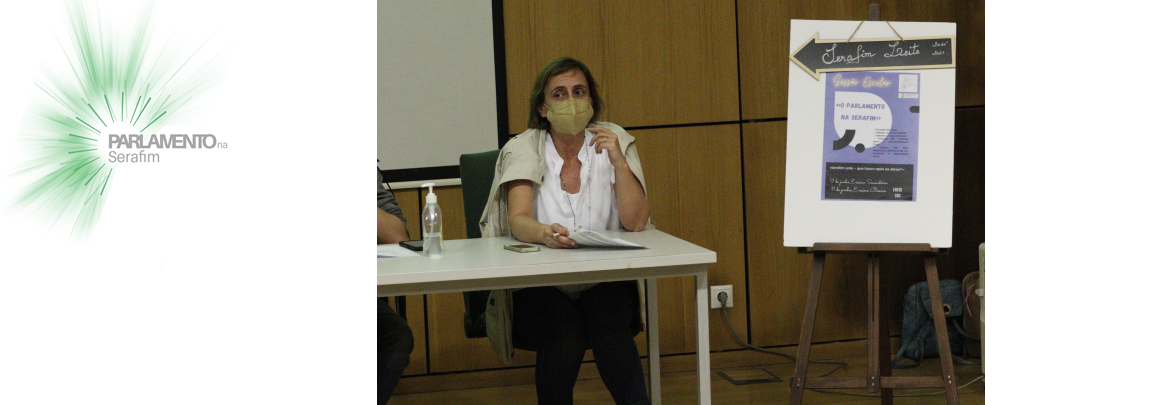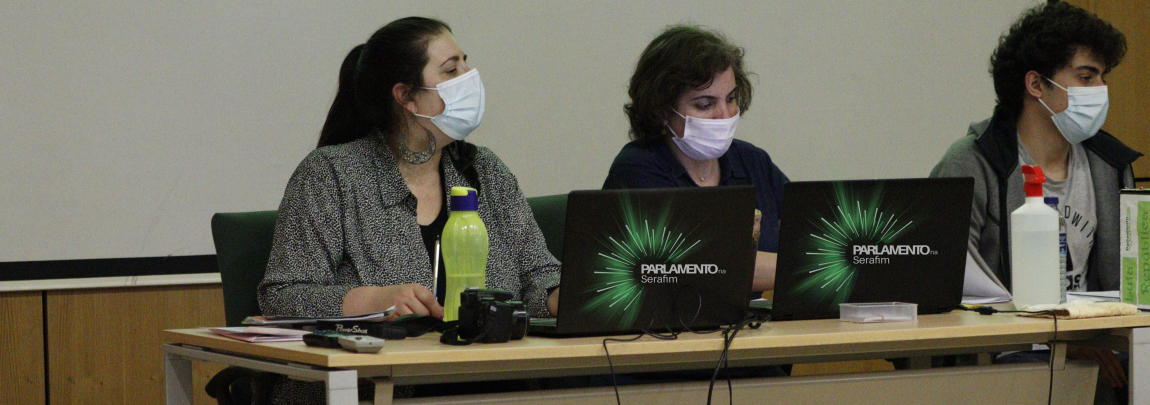 Mesa da Presidência da Sessão Escolar d’ «O Parlamento na Serafim» (Ensino Secundário): Dina Sarabando e Cristina Correia (Coordenadoras); Ricardo Mendes (12.ºA) como Secretário
