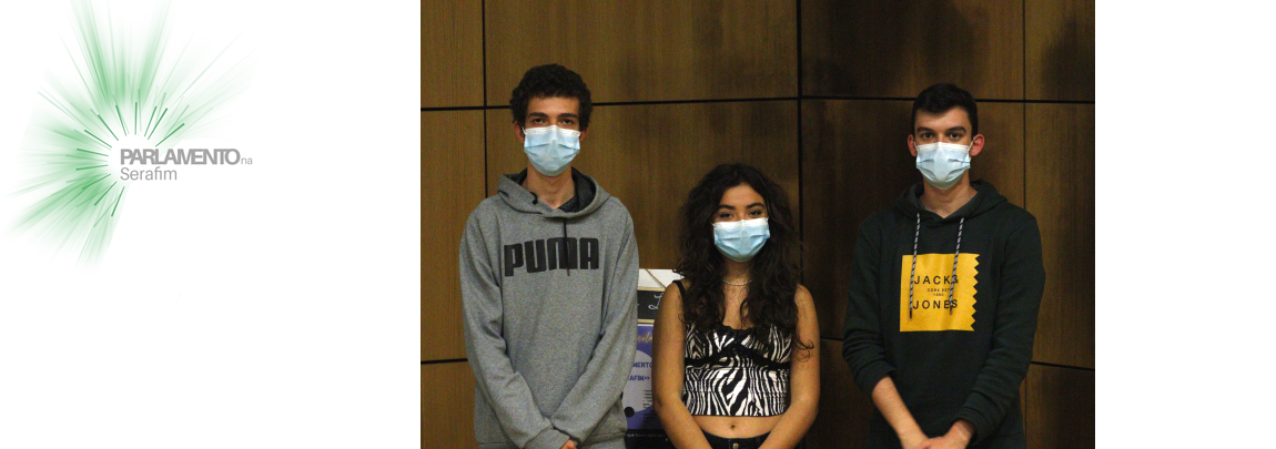 Representantes do Ensino Secundário na 1.ª edição d’ «O Parlamento na Serafim», na Assembleia do Conselho Geral (José Pedro Santos, do 12.º A, Isaac Soares, do 11.º A, e Maria Eduarda Oliveira, do 10.º B)