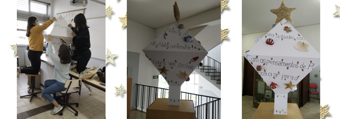 "Com os pensamentos de Platão no ar, o 11.º B um octaedro conseguiu montar, o poliedro que simboliza o ar, para o Natal comemorar". Foi este o mote para o trabalho dos alunos de Matemática B do 11.º B. Estes alunos construíram uma árvore com a forma de octaedro e os respetivos enfeites natalícios . Tudo começou com muita Matemática. Pensando no ambiente tentaram maximizar áreas de forma a utilizar o menor número de recursos. Tentaram dar vida a desperdícios de materiais que tinham utilizado noutros trabalhos e inspirados por Platão e seguindo o tema "Ar" construíram uma linda árvore de Natal.